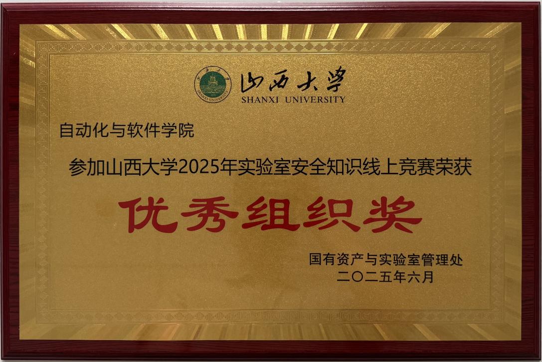 为深入宣传贯彻习近平总书记关于安全生产的重要论述和重要指示批示精神,切实保障全校师生生命财产安全,增强实验室安全应急处置技能,山西大学自动化与软件学院积极组织学生参加《山西大学 2025 年实验室安全知识》线上竞赛活动,并取得了优异成绩,学院也荣获优秀组织奖。