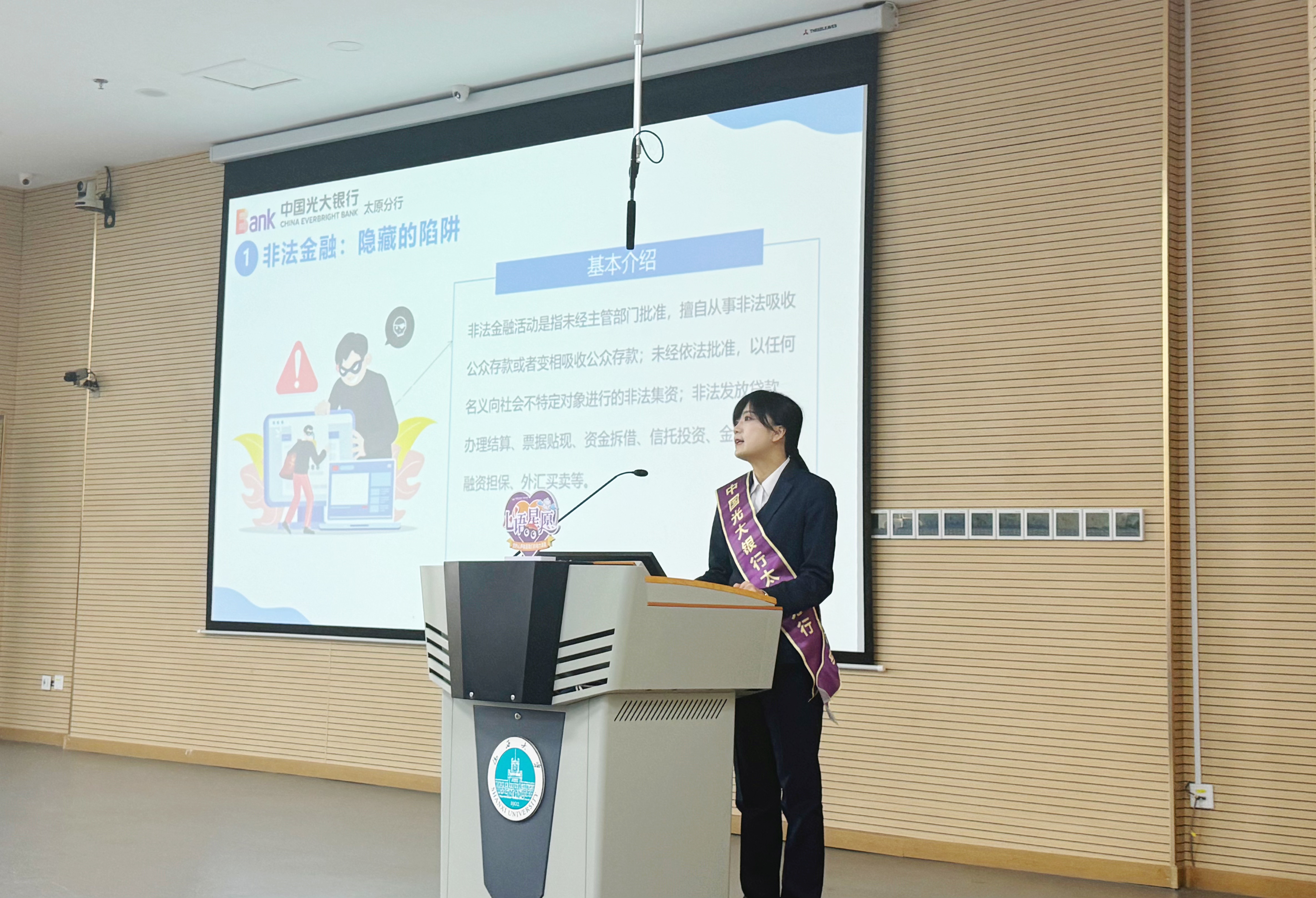 本次讲座特邀光大银行漪汾街支行金融消保宣传大使张靖芸担任主讲。张老师以"防范金融风险,守护消费权益"为主线,通过四大模块展开系统讲解:在"非法金融活动识别"环节,深入剖析网络借贷、虚拟货币等新型违法金融活动的运作模式;通过"消费者权益保护法规解读",结合《消费者权益保护法》重点条款,阐明金融交易中的法定权益;借助"反诈案例剖析"单元,运用视频资料还原刷单返利、冒充客服等典型诈骗场景;最后在"风险应对策略"部分,传授"三不原则"(不轻信、不透露、不转账)等实用防范技巧。