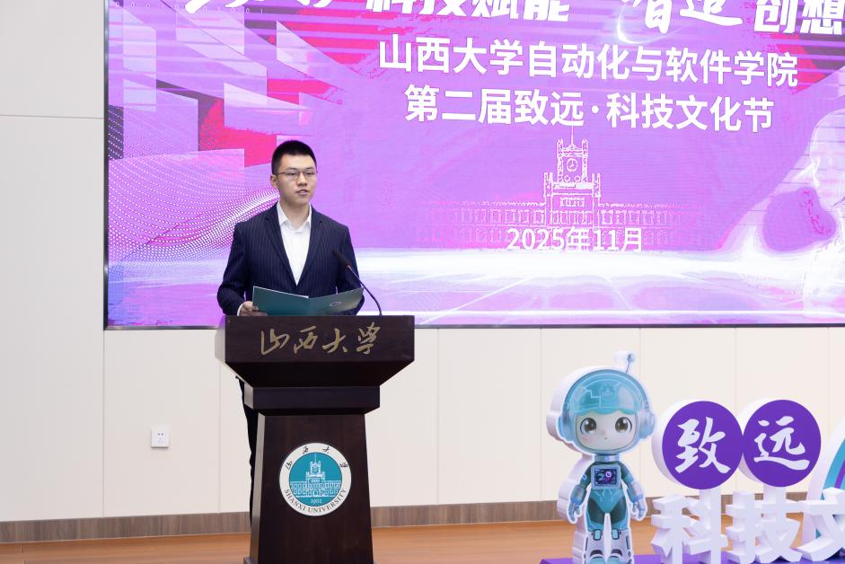 为深入贯彻落实党的二十届四中全会精神,激发学生创新潜能,提升综合素养,11月12日下午,山西大学自动化与软件学院第二届致远·科技文化节启动仪式在东山校区知行报告厅隆重举行。学院班子成员、各教研室与科室负责人、专兼职辅导员及学生代表参加启动仪式。活动由辅导员老师靳佳霖主持。