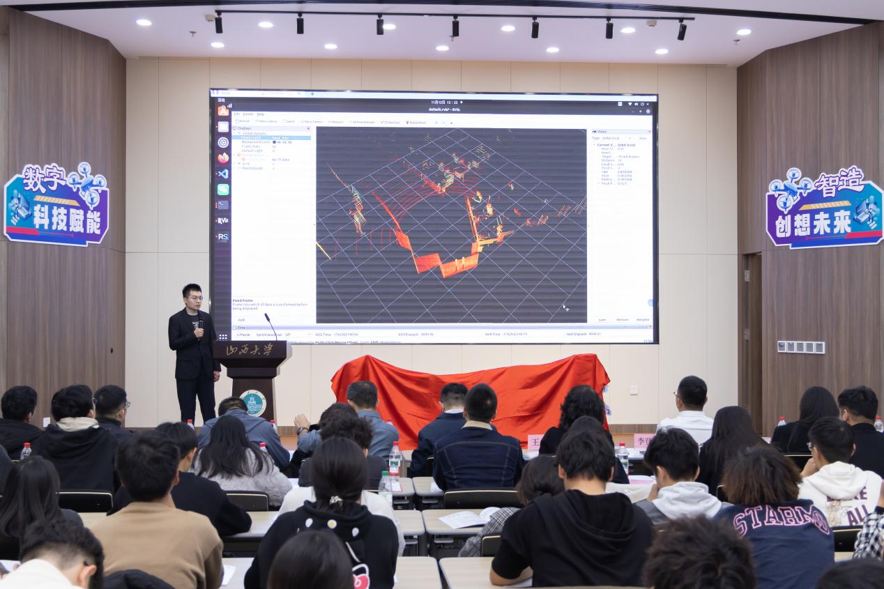 在创新成果展示环节,2024级研究生任一冉分享了《基于人体运动捕捉技术的网球运动水平分级模型构建》研究。该项目创新性地采用多传感器数据融合技术,通过对34名运动员运动数据的生物力学分析,构建了准确率达90%的评估模型,相关成果已投稿专业期刊。2025级研究生左维桓针对智能感知与导航机器人进行功能展示。该机器人搭载有32线高精度激光雷达等多传感器系统,内置机器人操作系统(ros),2025级研究生刘宗超、王俊杰现场辅助展示了实时环境建图、自主导航等核心功能。两项成果从理论研究到技术应用,生动体现了学院“软硬兼施”的学科魅力。