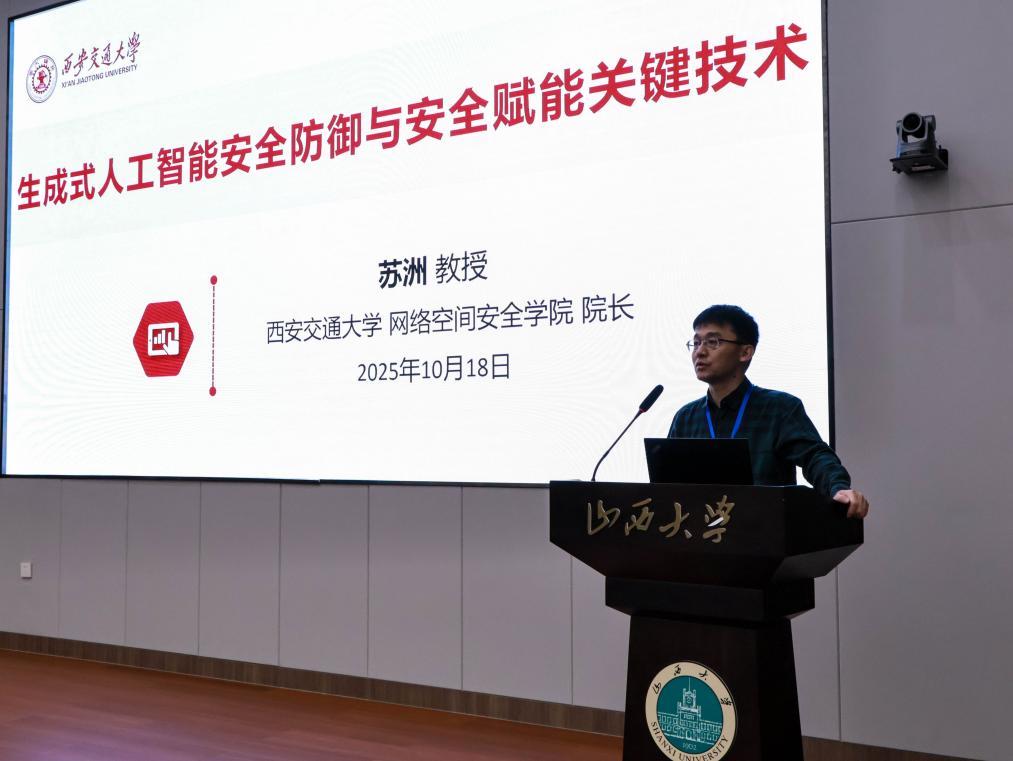 西安交通大学网络空间安全学院院长苏洲教授以《生成式人工智能安全防御与安全赋能关键技术》为题,探讨生成式人工智能安全防御架构、工作模式和关键特征。并针对人工智能数据安全和网络攻击威胁等挑战,研讨安全防御与安全赋能关键技术和最新研究进展。