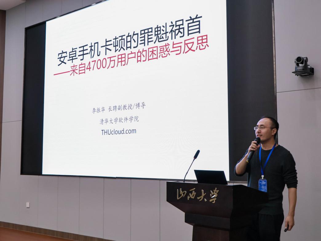 清华大学软件学院李振华教授以《安卓手机卡顿的罪魁祸首:来自4700万用户的困惑与反思》为题。报告从设备、系统、应用程序和应用市场四个角度确定了导致安卓手机卡顿的关键因素,并报告其团队重新设计了安卓进程的管理机制并实际应用于数千万部小米/红米手机,减少了60%的卡顿现象,同时节省了10.7%的耗电量。