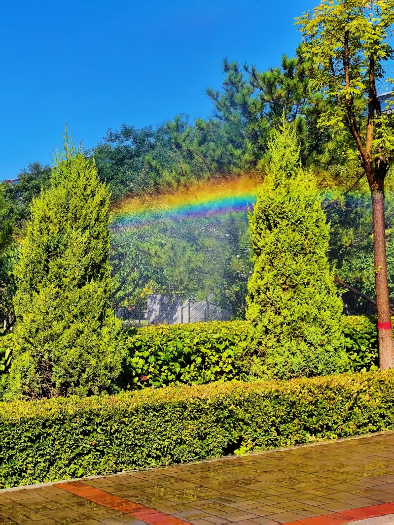 作品简介:洒水车走过的轨迹里,藏着夏日的小秘密。一道彩虹忽然跌进绿意,像给平凡的午后,系了条透明的彩绸。