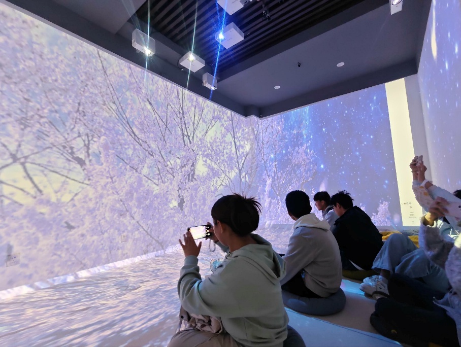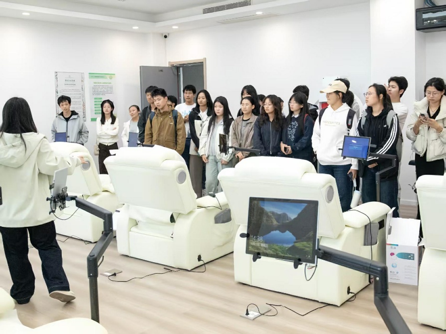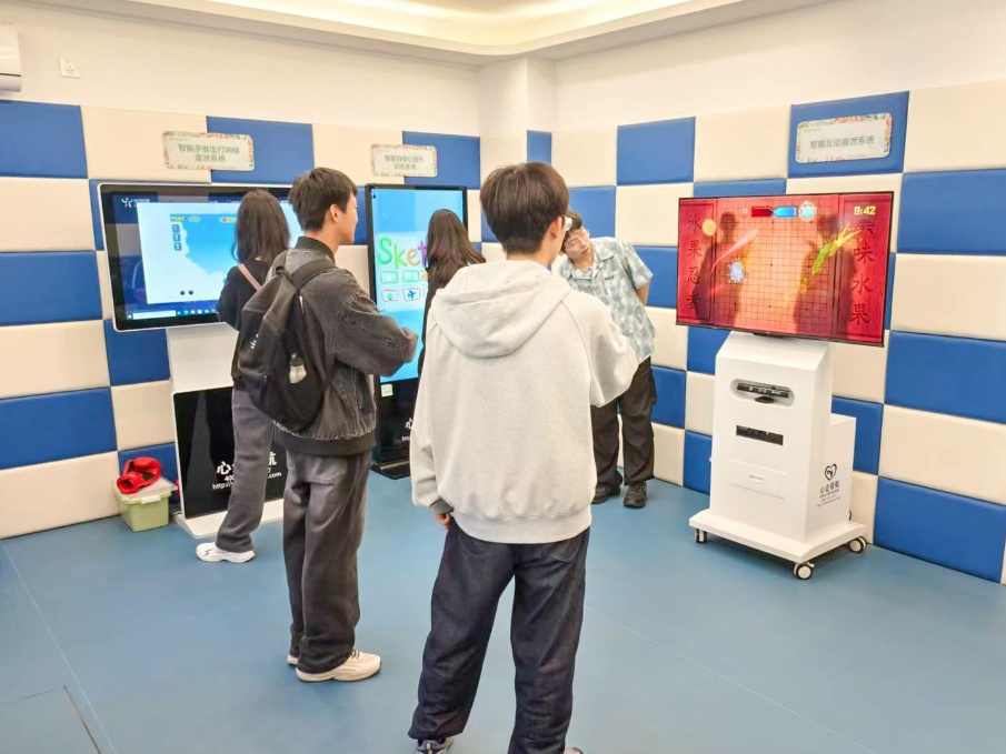 走近“心”世界,开启“心”旅程。在专业心理辅导助理的引导下,同学们依次探访了心理咨询室、团体辅导室、体感音乐放松室、减压宣泄室、运动心理训练室、身心训练室及沉浸体验室等多个功能区域。每一处空间都经过精心设计,从心理咨询室的温馨静谧,到团体辅导室的互动协作氛围,都让同学们对心理健康服务的多样性与专业性有了更直观和深刻的认知。